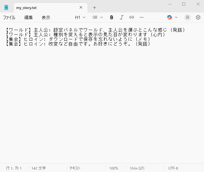- 書き終わったら保存を忘れずに。my_story.txtがDLされます。